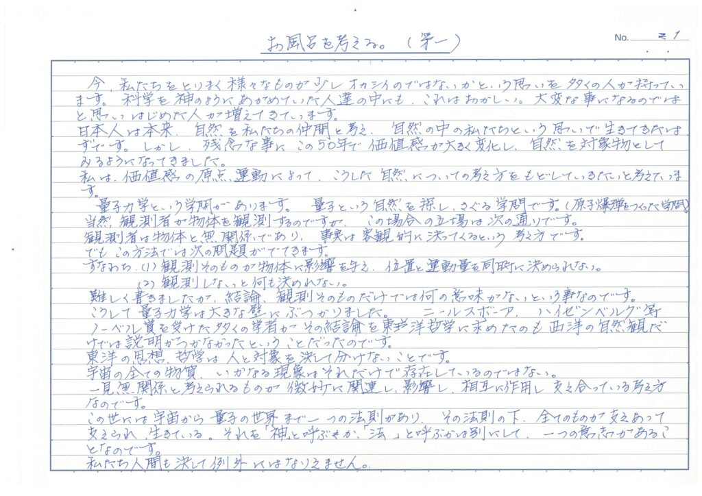 この世には宇宙から量子の世界まで一つの法則があり、その法則の下、全てのものが支えあって支えられ、生きている。それを「神」と呼ぶか、「法」と呼ぶかは別にして、一つの意志があることなのです。