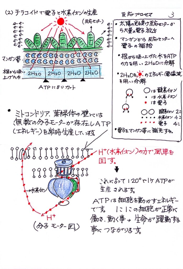 (2)チラコイドで電子と水素イオンの生産