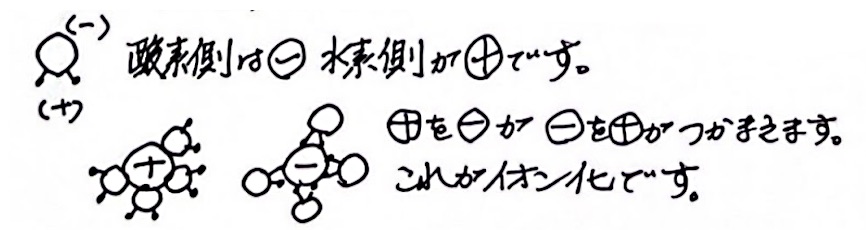 プラスをマイナスが、マイナスをプラスが捕まえます。これがイオン化です。